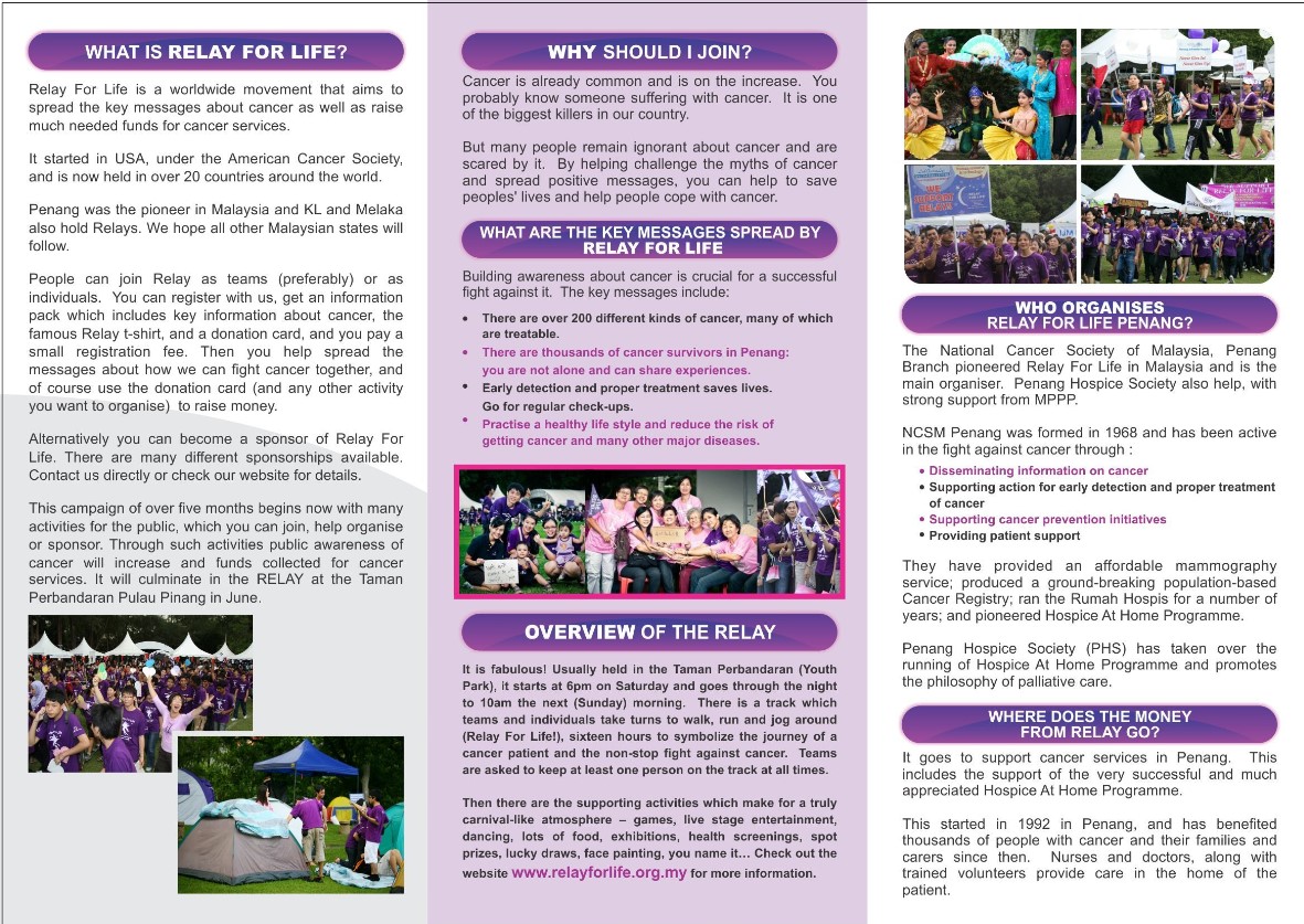RELAY FOR LIFE was initiated in 1985 by a volunteer of the American Cancer Society, Dr Gordon Klatt. Penang was the first cancer society in the country to be accorded the franchise. The start-up relay was held in 2005 and since held annually up to 2019.